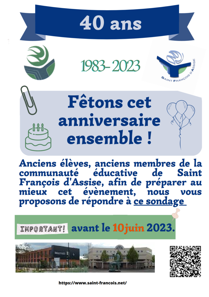 Nous allons bientôt fêter les 40 ans de notre bel établissement. Vous êtes anciens Élèves, Enseignants et/ou Personnels de l’Établissement, voici un sondage pour préparer la célébration.